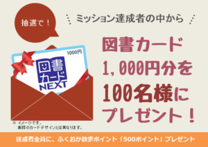 開催期間中に3日連続で8,000歩以上歩いた方の中から抽選で100名様に図書カード1,000円分をプレゼント。
