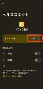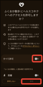 ④「ふくおか散歩にヘルスコネクトへのアクセスを許可しますか?」→【すべて許可】をONにしてください。