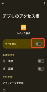 ⑤GoogleFitとふくおか散歩のアプリ権限にて身体活動(または運動データなど)がONになっていることを確認ください。